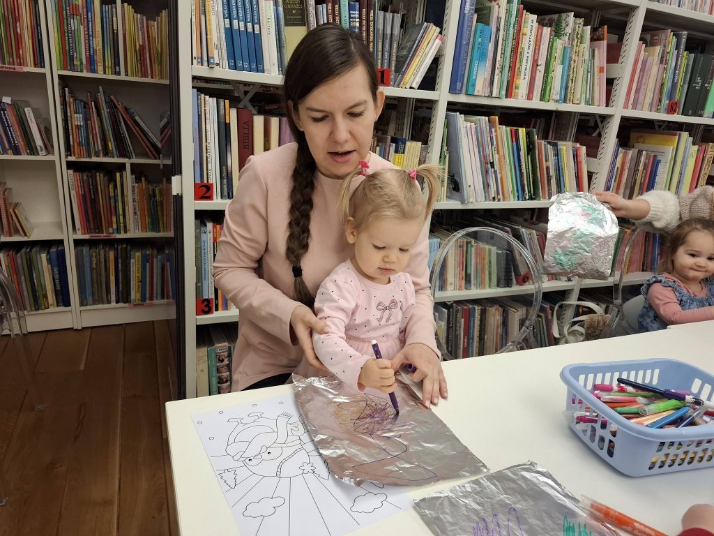 Kolejnym punktem było malowanie pingwinków w niecodzienny sposób: uczestnicy zajęć kolorowali folię aluminiową pisakami i odbijali wzory na kartkach. Nie zabrakło chwili na ruch i muzykę, a na zakończenie mali artyści wypełniali pojemniczki ryżem, zamieniając je w urocze bałwanki.