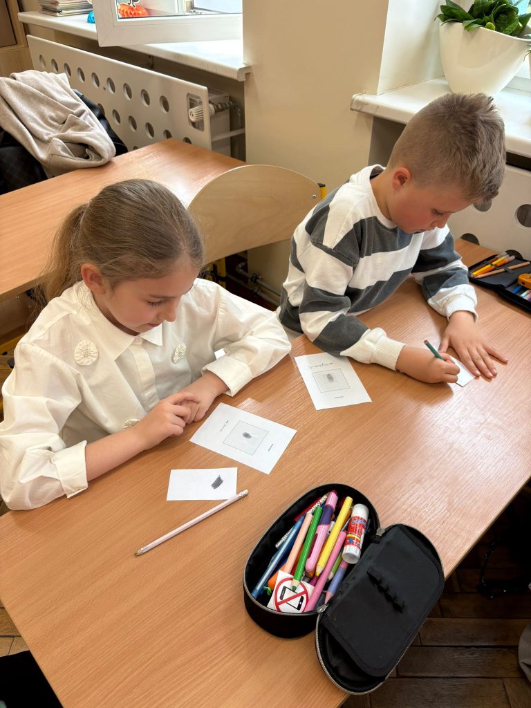 Po burzliwej dyskusji uczestnicy przeszli do działań praktycznych. Poznali podstawy daktyloskopii, wykonali proste doświadczenie oraz odbijali własne odciski palców, obserwując linie papilarne. Następnie rozwiązywali zagadki logiczne i dopasowywali tropy zwierząt.