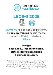 Legimi – lipiec 2025 Published 25 czerwca 2025 | By Czytelnia Kody dostępu do platformy Legimi wydawane będą od godziny 9:00 w czytelni.