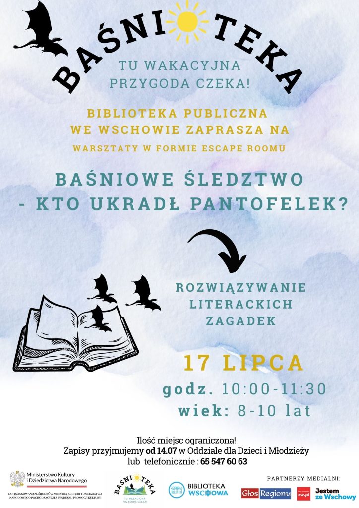 Zapraszamy do zapisów na kolejne wakacyjne zajęcia! Tym razem na dzieci czekać będzie baśniowe śledztwo🔍👠🧚‍♀️. Szczegóły na plakacie poniżej.