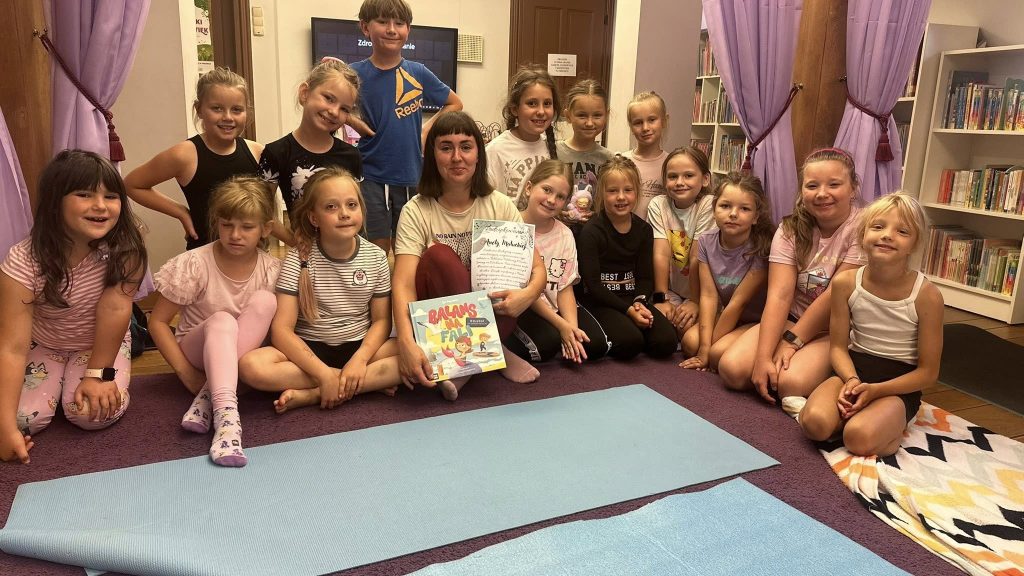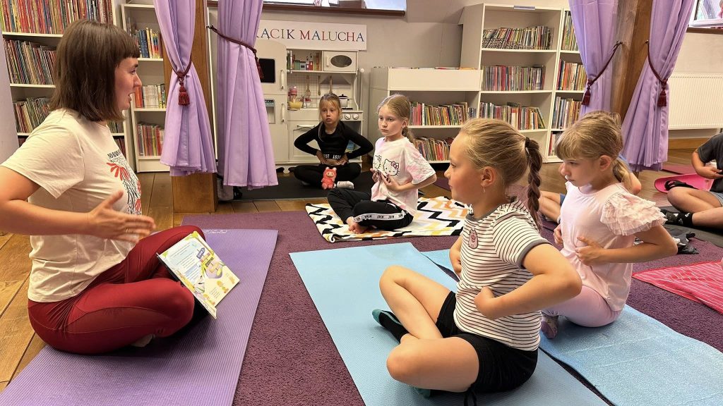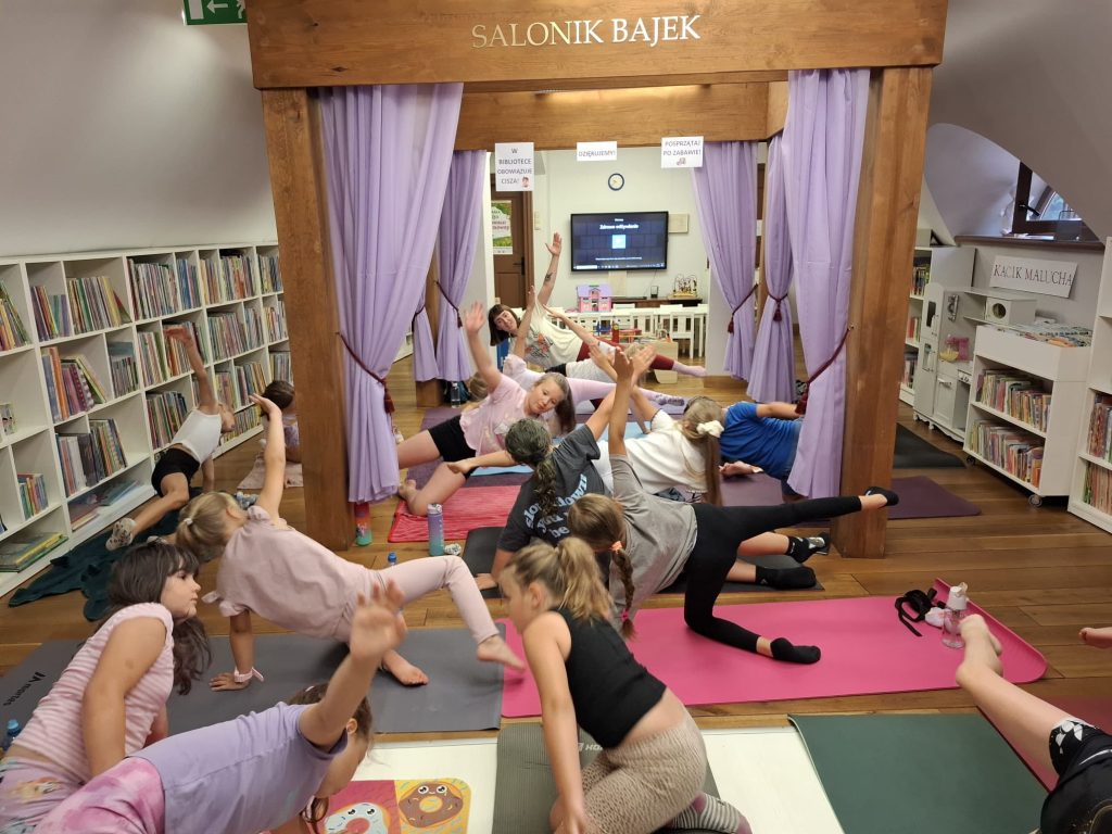 Wczoraj odbyły się pierwsze wakacyjne zajęcia w bibliotece. Spotkanie rozpoczęło się wizytą Anety Małuckiej, która poprowadziła zajęcia z pilatesu inspirowane książką „Balans na fali” autorstwa Igi Majewskiej. Dzieci miały szansę wcielić się w postacie z bajki, co z pewnością podniosło ich nastrój i energię.