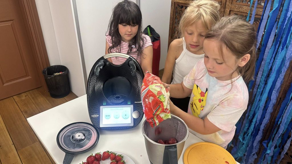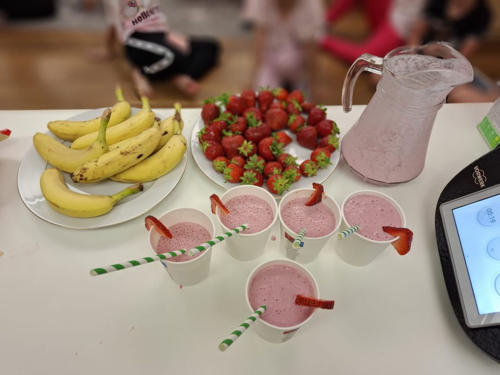 Następnie dzieci miały możliwość wykazać się talentem plastycznym, tworząc blendery z wyklejanek pełnych kolorowych owoców i warzyw. Ich wyobraźnia nie miała ograniczeń.