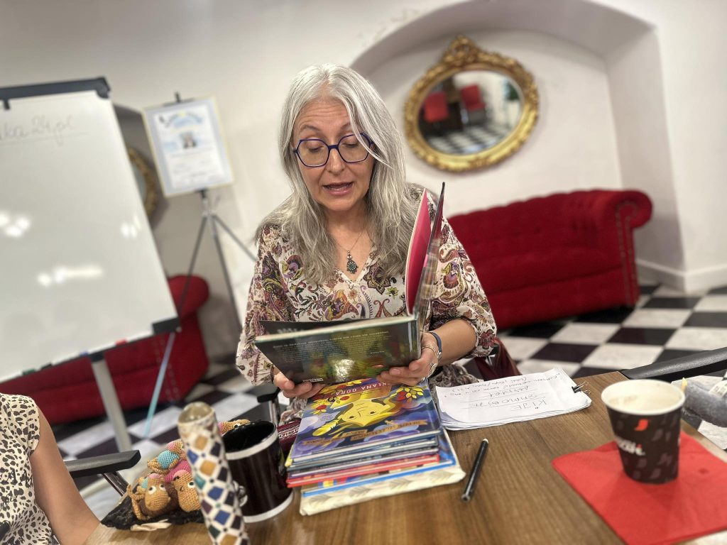 Podczas spotkania autorka zaprezentowała dzieciom swoją twórczość, koncentrując się na cyklu „Siedem szczęśliwych, czyli baśnie nie dość znane”. W przystępny i pełen pasji sposób opowiadała o klasycznych baśniach, które przełożyła na współczesne czasy, pokazując ich aktualność i uniwersalne przesłania. Przykładem były opowieści takie jak „Kwiat paproci” oraz „Kije samobije”, które posłużyły jako punkt wyjścia do rozmów o aktualnych problemach dzieci i młodzieży.