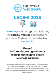 Legimi – wrzesień 2025 Published 20 sierpnia 2025 | By Czytelnia Darmowy kod dostępu do platformy Legimi dostępny od 1 września w czytelni.🎧📖