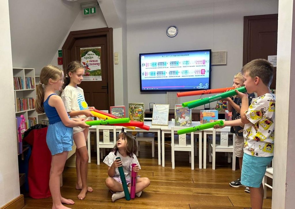 Wakacje wcale nie muszą być nudne – przekonali się o tym uczestnicy kolejnych zajęć realizowanych w ramach projektu „Baśnioteka – tu wakacyjna przygoda czeka”, które odbyły się 14 sierpnia w naszej bibliotece. Tym razem najmłodsi wzięli udział w niezwykłych warsztatach literacko-muzycznych, łączących klasyczną literaturę, kreatywną improwizację i elementy teatru.