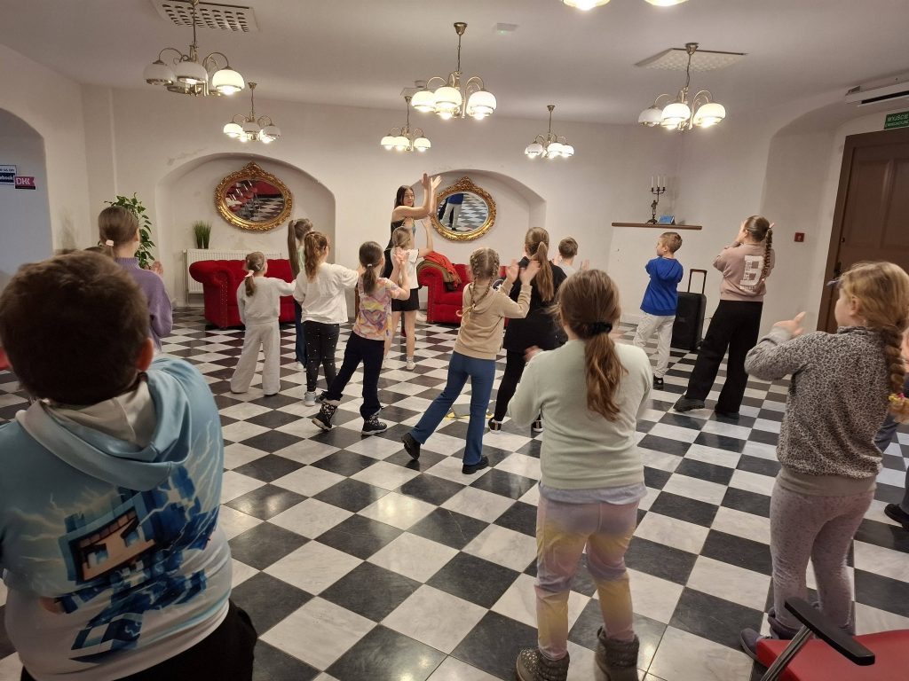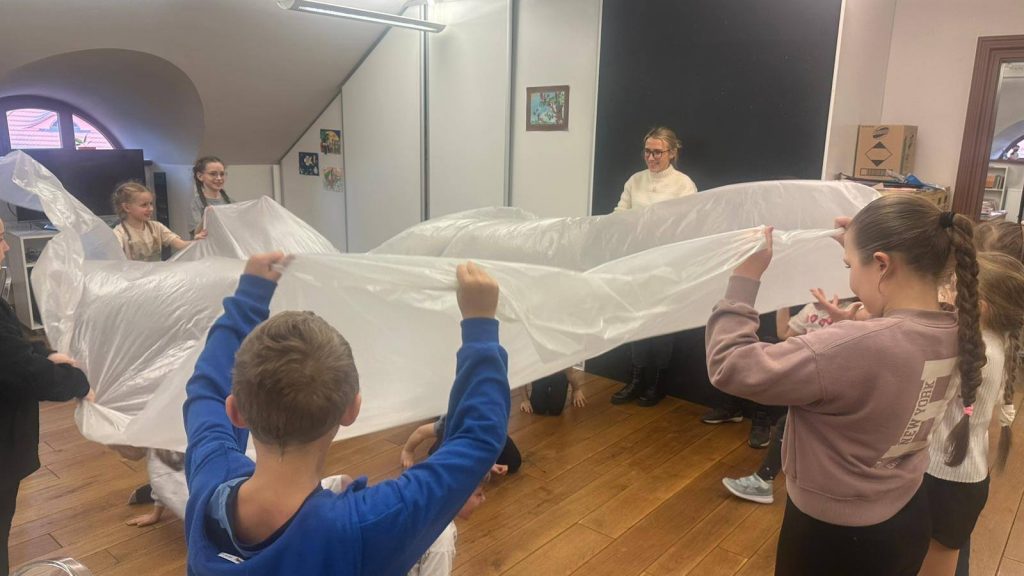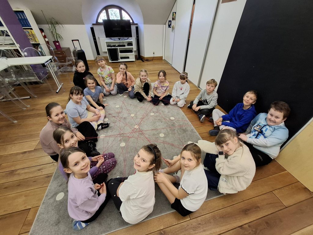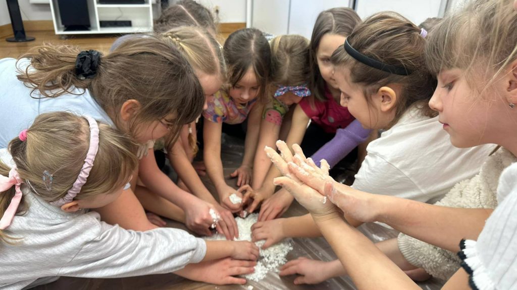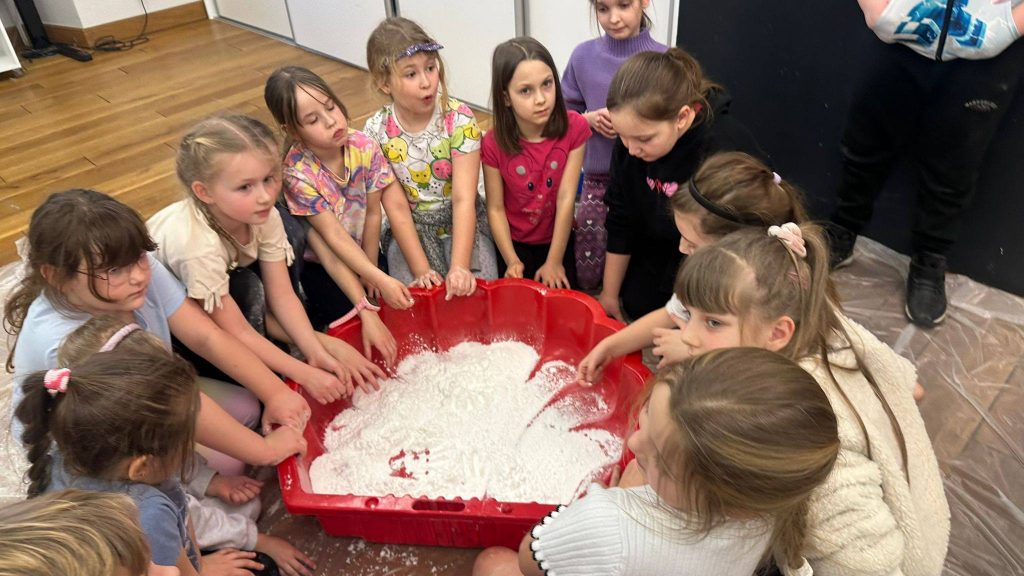 Podczas oglądania książeczki dzieci odnajdywały ukryte przedmioty w różnych barwach. Następnie tworzyły tęczę, nanosząc farby pipetkami. Wiele radości przyniósł także eksperyment „Deszczowa chmura”, który pokazał, jak powstaje deszcz i jak pięknie mieszają się kolory. Uczestnicy ćwiczyli także spostrzegawczość, segregując pompony według barw. Na zakończenie powstały piękne wiosenne przebiśniegi.