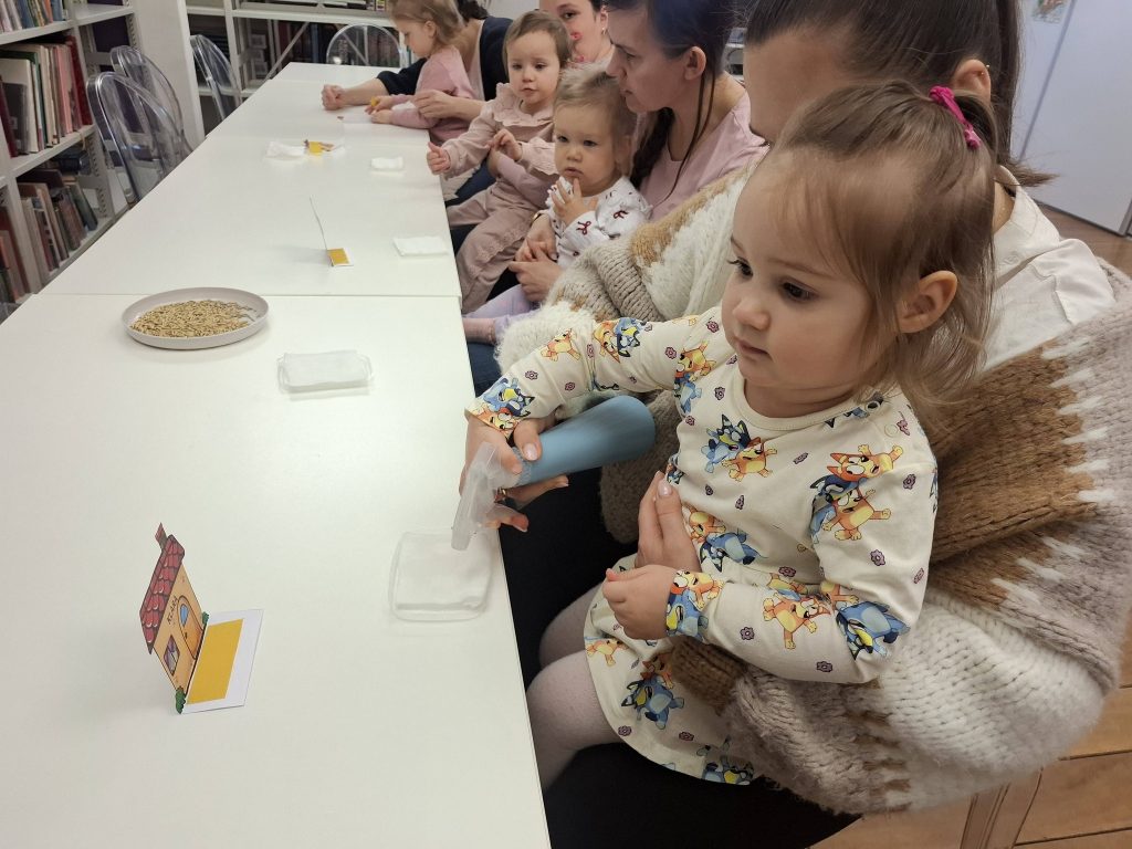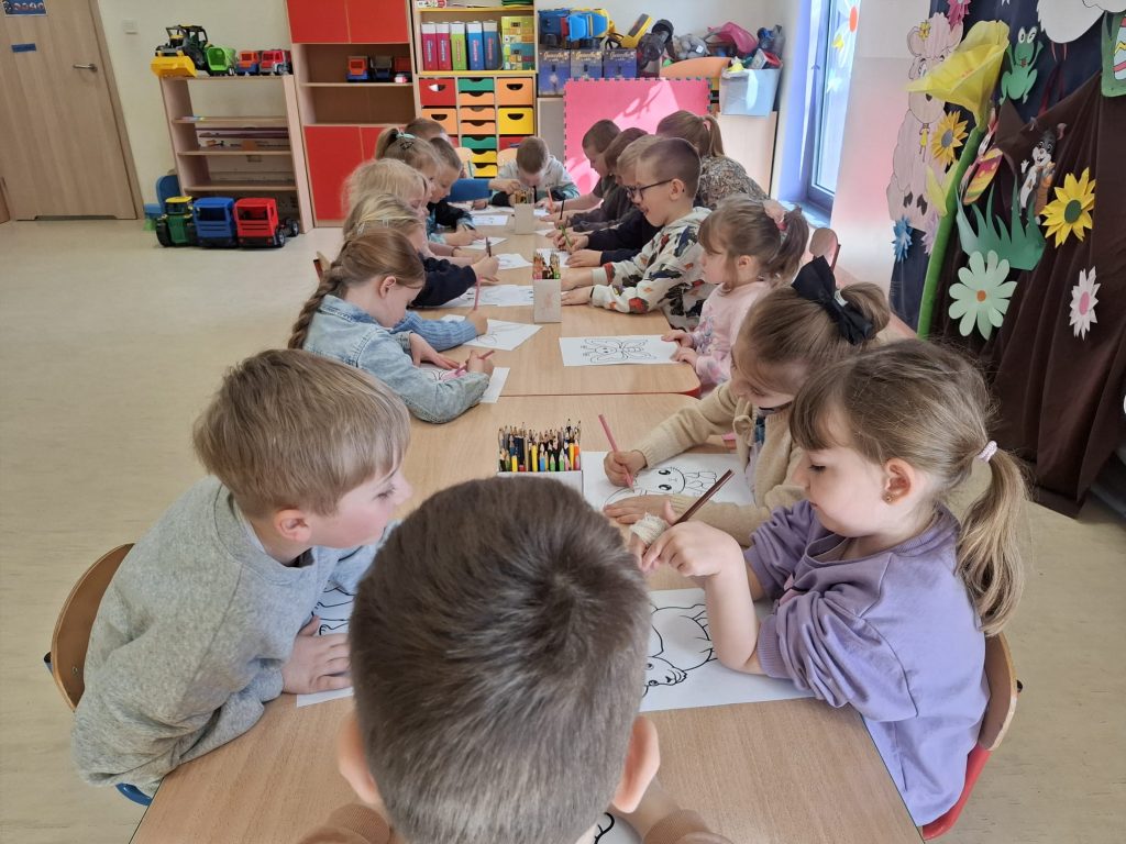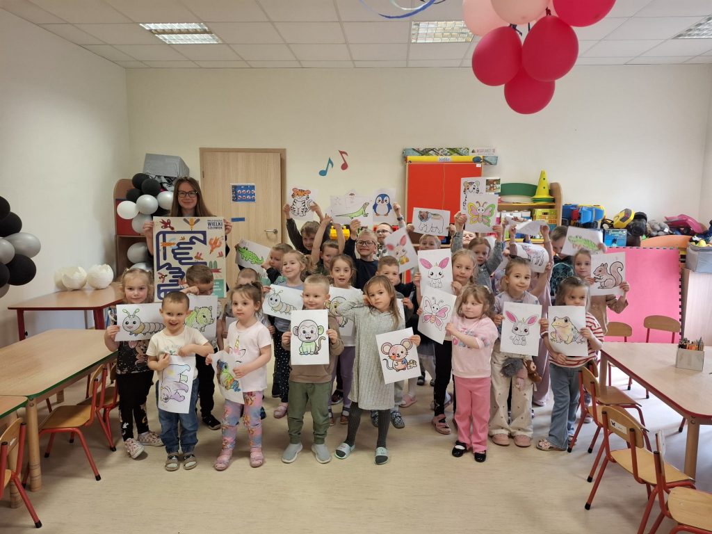 Podczas spotkania dzieci dowiedziały się, na czym polega udział w projekcie. W części czytelniczej wysłuchały fragmentu książki „Przywitanie lata” autorstwa Marii Dek – jednej z publikacji dostępnych w ramach wyprawki czytelniczej. W dalszej części zajęć przedszkolaki aktywnie uczestniczyły w odkrywaniu bohaterów opowieści, rozpoznając występujące w niej stworzenia. Nie zabrakło również elementów ruchowych – dzieci rzucały kostką i z entuzjazmem naśladowały ruchy oraz odgłosy wylosowanych zwierzątek, co sprzyjało integracji i rozwijaniu wyobraźni. Na zakończenie każde dziecko otrzymało do pokolorowania ilustrację przedstawiającą jednego z bohaterów oraz zakładkę promującą akcję, zachęcającą do odwiedzin biblioteki i rozpoczęcia własnej przygody z czytaniem.